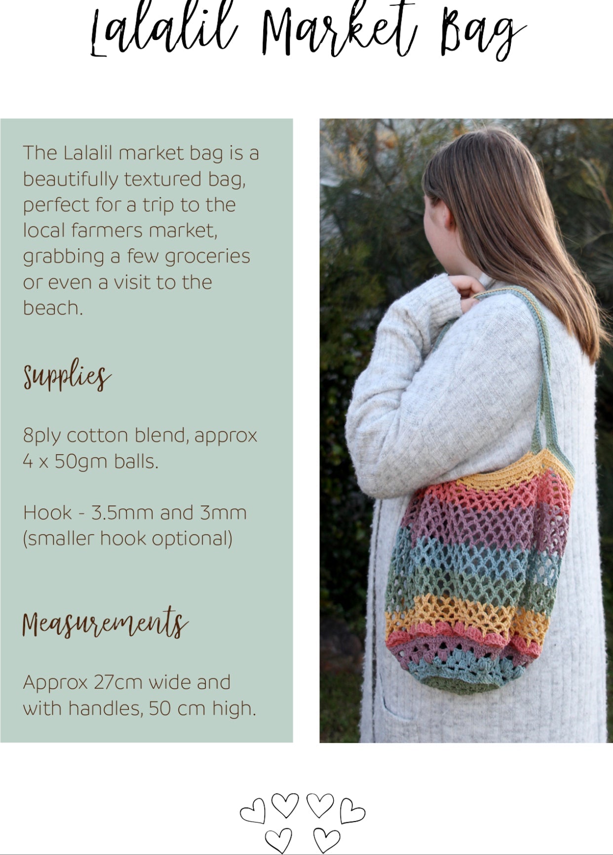 Lalalil Market Bag is a beautifully textured bag, perfect for a trip to the local farmers markets, grabbing a few groceries or even a visit to the beach. Designed by our very own local crochet designer Rebecca Griffin.